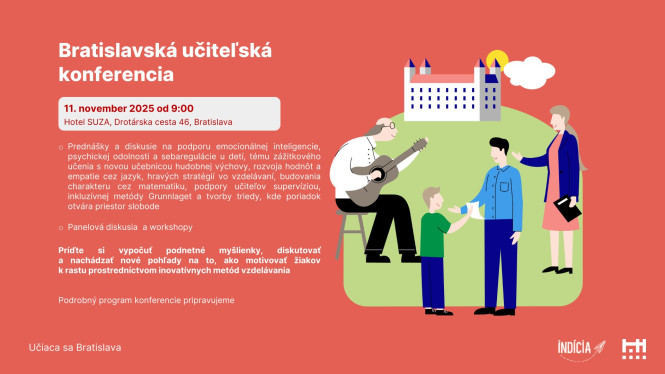 Mesto Bratislava v spolupráci s Indíciou organizuje už po ôsmy raz Bratislavskú učiteľskú konferenciu pre pedagogických pracovníkov, riaditeľov a zriaďovateľov bratislavských materských a základných škôl. Konferencia sa bude sa konať pod záštitou primátora hlavného mesta Slovenskej republiky Bratislava.