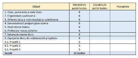 - Zaradenie školy do škály na základe získaných bodov. Pásma, v ktorých budú oceňované školy: