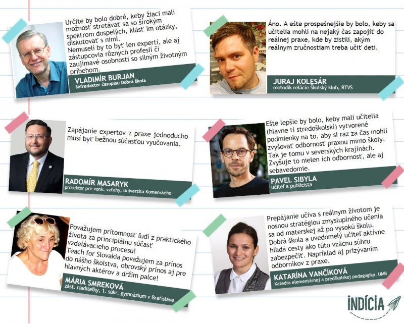 Katarína Vančíková, vedúca Katedry elementárnej a predškolskej pedagogiky, UMB v Banskej Bystrici: Prepájanie učiva s reálnym životom je nosnou stratégiou zmysluplného učenia sa od materskej až po vysokú školu. Dobrá škola a uvedomelý učiteľ aktívne hľadá cesty, ako túto vzácnu súhru zabezpečiť. Napríklad aj prizývaním odborníkov z praxe.