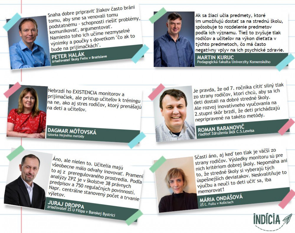 Mária Ondášová, učiteľka, ZŠ Ľ. Fullu v Košiciach: Sčasti áno, aj keď ten tlak je väčší zo strany rodičov. Výsledky monitoru sú pre nich kritériom dobrej školy. Nepomáha ani to, že stredné školy si vyberajú tých úspešnejších deviatakov. Neskvalitňuje to výučbu a neučí to deti učiť sa, iba memorovať!
