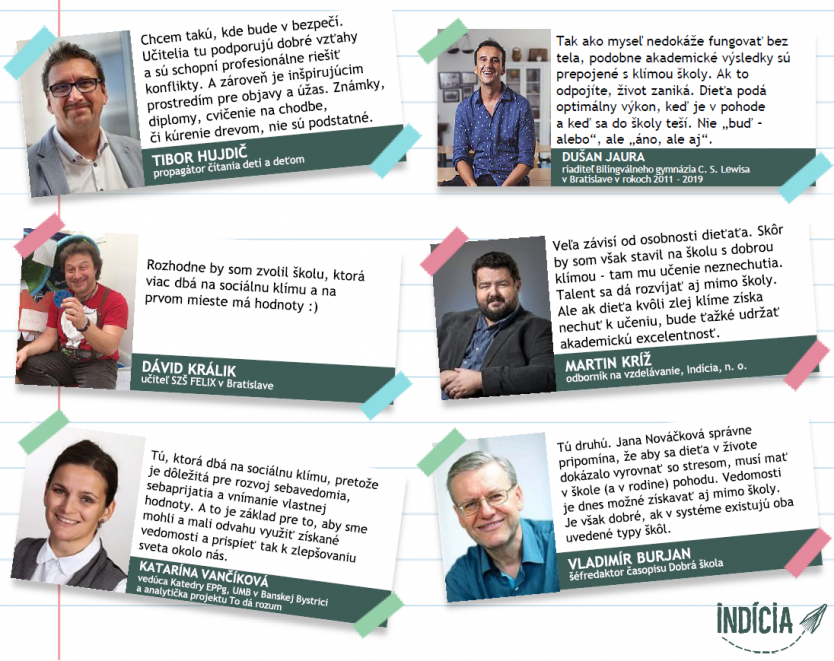 Radomír Masaryk, prorektor pre vonkajšie vzťahy, Univerzita Komenského: Úlohou školy by podľa mňa malo byť tieto dve stránky vyvažovať. Pri škole, ktorá bude presadzovať sociálnu klímu na úkor akademických výsledkov hrozí riziko, že prestane plniť svoju primárnu vzdelávaciu funkciu. Pri škole, ktorá bude presadzovať akademické výsledky na úkor sociálnej klímy (čo je mnoho častejší príklad) zas hrozí vznik toxického prostredia. Pre svoje dieťa by som hľadal školu, ktorá dokáže sociálnu klímu a akademické nároky citlivo vybalansovať