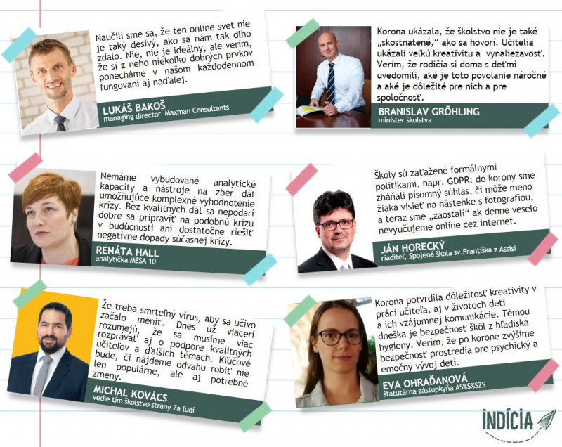 Katarína Vančíková, vedúca Katedry elementárnej a predškolskej pedagogiky, UMB v Banskej Bystrici: Vďaka nej mohli učitelia objaviť nové možnosti učenia, mali príležitosť kriticky premýšľať o povahe učiva, učebných úloh či hodnotenia, stať sa citlivejšími na potreby detí a ich rodín a stanoviť si nové osobné výzvy.