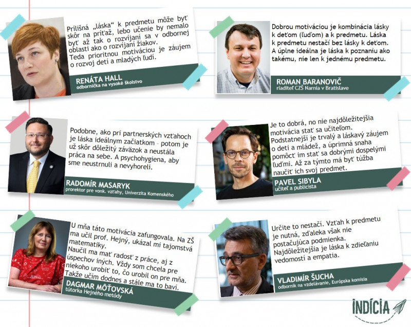 Renáta Hall, odborníčka na vysoké školy: Prílišná „láska“ k predmetu môže byť skôr na príťaž, lebo učenie by nemalo byť až tak o rozvíjaní sa v odbornej oblasti ako o rozvíjaní žiakov. Teda prioritnou motiváciou je záujem o rozvoj detí a mladých ľudí.