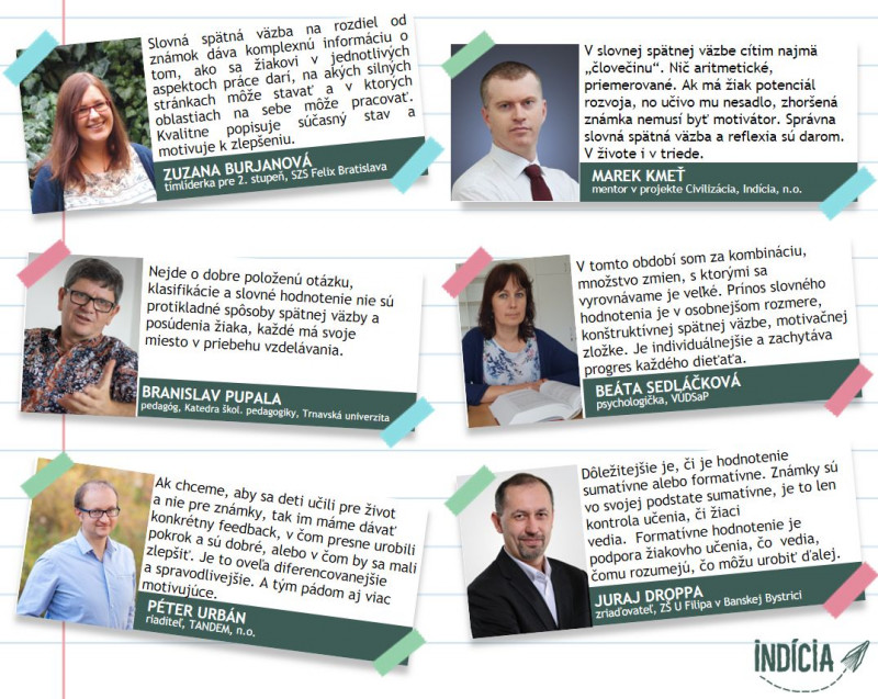 Zuzana Burjanová, tímlíderka pre 2. stupeň, SZŠ FELIX, Bratislava: Slovná spätná väzba na rozdiel od známok dáva komplexnú informáciu o tom, ako sa žiakovi v jednotlivých aspektoch práce darí, na akých silných stránkach môže stavať a v ktorých oblastiach na sebe môže pracovať. Kvalitne popisuje súčasný stav a motivuje k zlepšeniu.