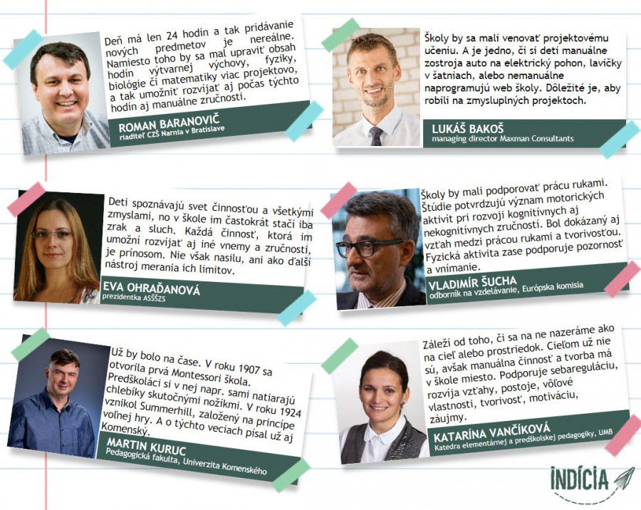 Roman Baranovič, riaditeľ CZŠ Narnia v Bratislave: Deň má len 24 hodín a tak prístup zavádzania nových a nových vecí formou pridávania predmetov a hodín a podobne, ktoré by mali robiť školy, je nereálny. Čo je reálne a čo by sa malo robiť, je premyslieť to, čo sa na školách už bežne robí, a upraviť to tak, aby tieto aktivity lepšie rozvíjali napr. manuálne zručnosti. Teda miesto zavádzania nových hodín predmetu technické práce alebo nového predmetu upraviť obsah hodín výtvarná výchova alebo fyzika, biológia, matematika viac projektovo, a tak umožniť pri prehlbovaní vedomostí z daného predmetu rozvíjať aj manuálne zručnosti.