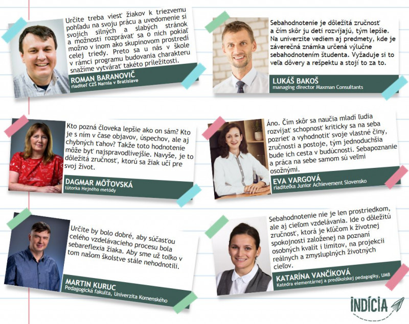 Katarína Vančíková, vedúca Katedry elementárnej a predškolskej pedagogiky, UMB v Banskej Bystrici: Sebahodnotenie nie je len prostriedkom, ale aj cieľom vzdelávania. Ide o dôležitú zručnosť, ktorá je kľúčom k životnej spokojnosti založenej na poznaní osobných kvalít i limitov, na projekcii reálnych a zmysluplných životných cieľov.