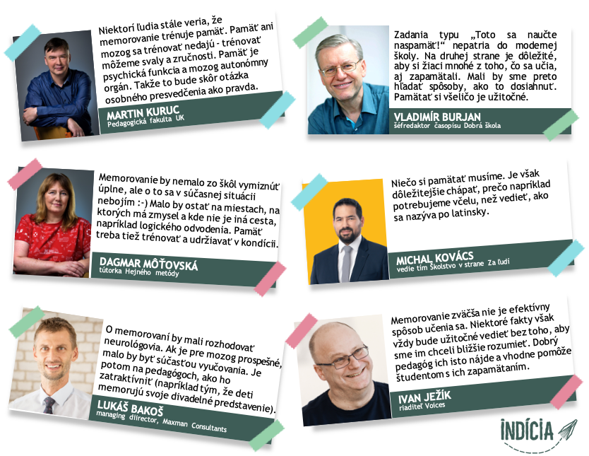 Vladimír Burjan, šéfredaktor časopisu Dobrá škola: Zadania typu „Toto sa naučte naspamäť!“ nepatria do modernej školy. Na druhej strane je dôležité, aby si žiaci mnohé z toho, čo sa učia, aj zapamätali. Mali by sme preto hľadať spôsoby, ako to dosiahnuť. Pamätať si všeličo je užitočné.
