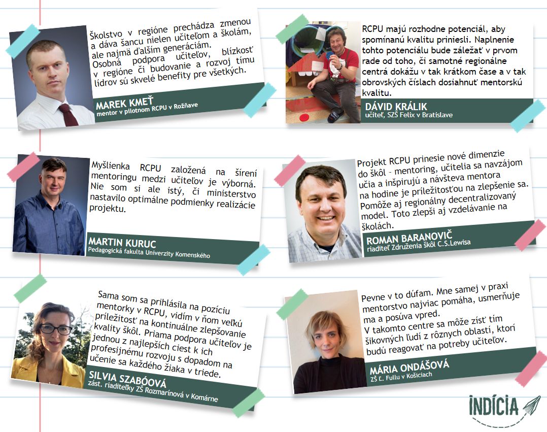 Roman Baranovič, riaditeľ CZŠ Narnia v Bratislave: Verím, že projekt RCPU prinesie niekoľko doteraz chýbajúcich dimenzií do škôl – samotný koncept mentoringu, teda že učitelia sa môžu navzájom učiť a inšpirovať a že návšteva druhého učiteľa na hodine nemusí byť len trestom, ale hlavne príležitosťou na zlepšenie sa. Prínosný je aj samotný regionálny decentralizovaný model, keď sa o možnosť podporovať učiteľov v danom regióne budú uchádzať viacerí hráči, čo by malo viesť k zlepšeniu služieb podpory učiteľov. Cez tieto nástroje, ak sa ich podarí zachovať pri živote a budovať, sa postupne môže zlepšovať aj samotné vzdelávanie poskytované na školách.