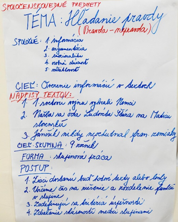 Hlavnou úlohou každej skupiny bolo vybrať jednu tému (cez predmety), pri ktorej by bolo možné so žiakmi pracovať so zručnosťami, ktoré súvisia s kritickým myslením, mediálnou gramotnosťou a objektívnym vyhodnocovaním situácie, dát a faktov.