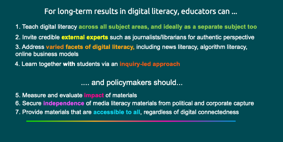 S pribúdajúcimi materiálmi zameranými na mediálnu gramotnosť, tréningovými cvičeniami a plánmi vyučovacích hodín učitelia potrebujú štandardy kvality a jasné ciele dopadu, aby mohli pracovať so svojimi študentmi. Treba, aby identifikovali vplyvné moduly v polarizovanom svete. Toto je úloha, pri ktorej sa akademický výskum, verejné financovanie a spätná väzba učiteľov z terénu musia stretnúť a byť súčinní.