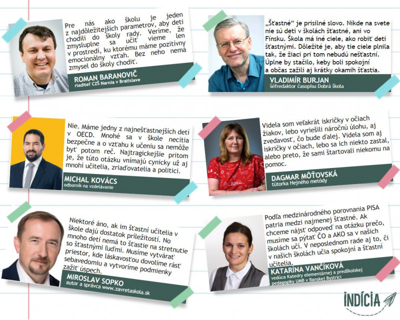 Martin Kuruc, Pedagogická fakulta Univerzity Komenského: Je ťažké odpovedať či sú deti v našich školách šťastné. Možno by stačilo, ak by boli spokojné. Tie, ktoré môžu zažívať v škole pocit úspechu vďaka podpore svojich rodín, spokojné byť môžu, pre tie ktoré ju nemajú, to je v našich školách ťažké. A takých nie je ich málo.