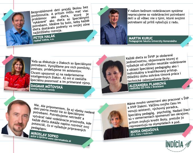 Peter Halák, riaditeľ, Indícia, n.o.: Myslim si, že každé dieťa si zaslúži našu pozornosť. Často práve skĺzame do toho, že menej výrazné a bezproblémové deti akosi prejdú školským systémom bez povšimnutia. A pritom môžu mať oveľa viac problémov ako dieťa, ktoré je "vykázané" ako dieťa so špeciálnymi potrebami. Rovnako sa stretávame s tým, že nadaným deťom sa venuje menej pozornosti, alebo sa im nevieme venovať. Ideálny stav by bol, keby sme s učivom vedeli pracovať tak, aby každé dieťa dostávalo podnety vo svojej zóne najbližšieho rozvoja. Teda každý aby sa vedel posúvať dopredu odtiaľ, kde je. Problém je, ak si myslíme, že existuje nejaká norma alebo zlata stredná cesta, ktorá by mohla vyhovovať väčšine. Našťastie mame veľa učiteľov, ktorí dokážu svoje pedagogické majstrovstvo využiť v prospech veľkej časti detí, ktoré učia.