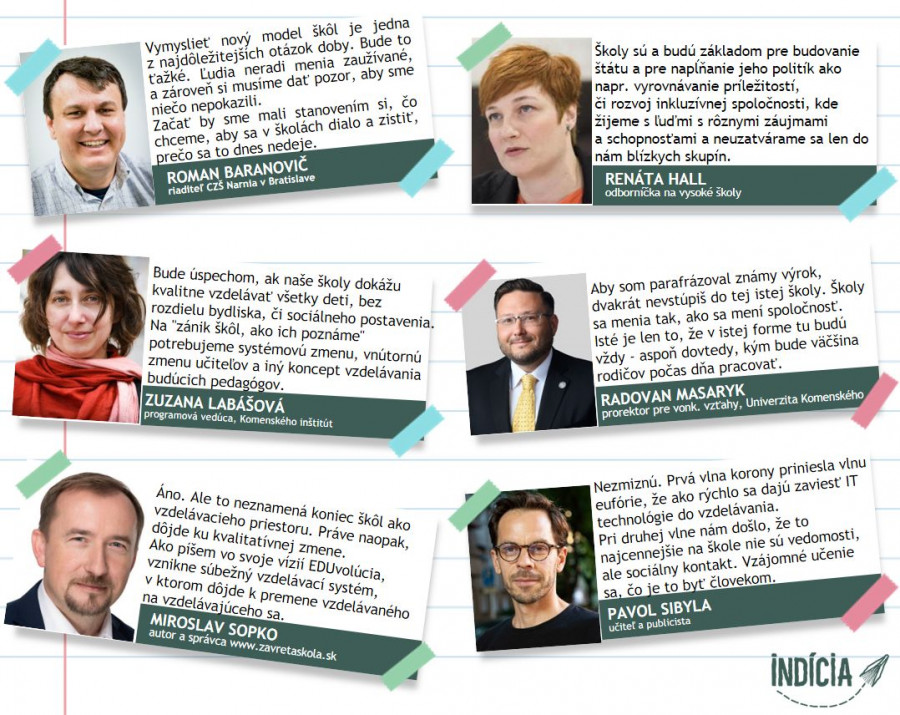 Zuzana Labašová, programová vedúca, Komenského inštitút: Nie. Ak nám tento rok o našom školstve niečo ukázal, tak predovšetkým to, že sú v ňom priepastné rozdiely. Bude obrovským úspechom, ak sa priblížime k školám v tej podobe, ako ich poznáme, ktoré dokážu kvalitne a participatívne poskytnúť vedomosti všetkým deťom bez rozdielu miesta bydliska či sociálneho postavenia. Na "zmenu škôl v tej podobe, ako ich poznáme" potrebujeme nielen systémovú zmenu, ale aj vnútornú zmenu učiteľov a podstatne iný koncept vzdelávania budúcich pedagógov.