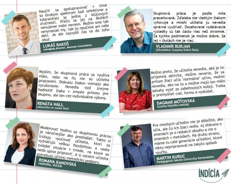 Vladimír Burjan, šéfredaktor časopisu Dobrá škola: Skupinová práca je podľa mňa preceňovaná. Zďaleka nie všetkým žiakom vyhovuje a mnohí učitelia ju nevedia správne využívať. Dosahované vzdelávacie výsledky sú tak často viac než skromné. Za týchto podmienok je možno dobre, že jej v školách nie je viac.