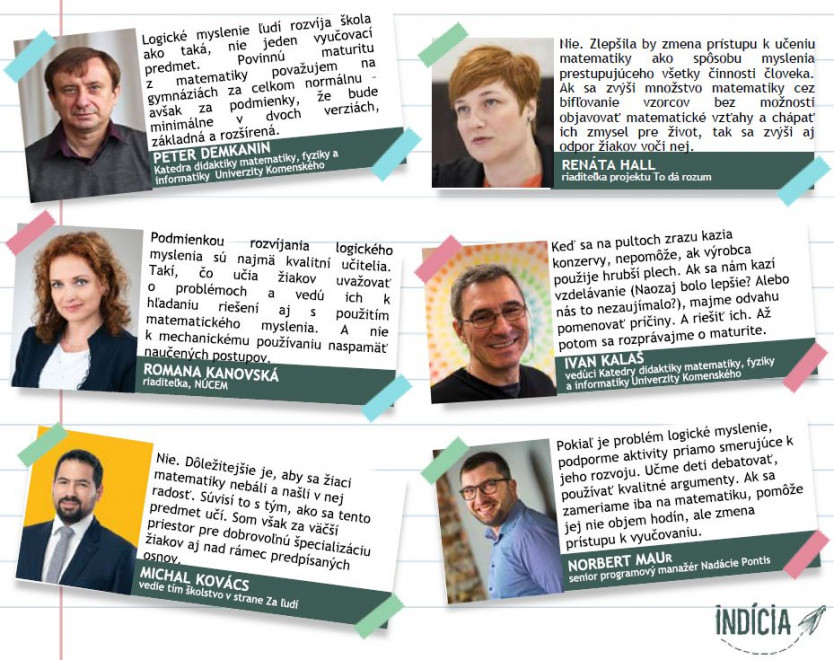 Peter Demkanin, Katedra didaktiky matematiky, fyziky a informatiky Univerzity Komenského: Logické myslenie ľudí rozvíja škola ako taká, nie jeden vyučovací predmet. Povinnú maturitu z matematiky považujem na gymnáziách za celkom normálnu – avšak za podmienky, že bude minimálne v dvoch verziách, základná a rozšírená.